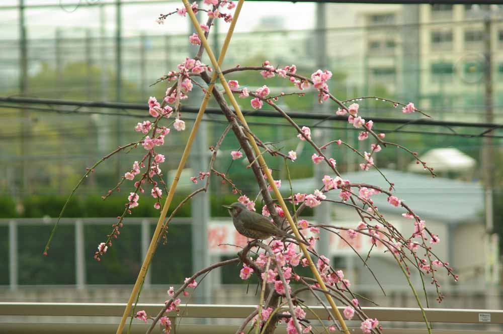 今日もしだれ梅の枝にとまってもぐもぐ大根の葉を食べていました。